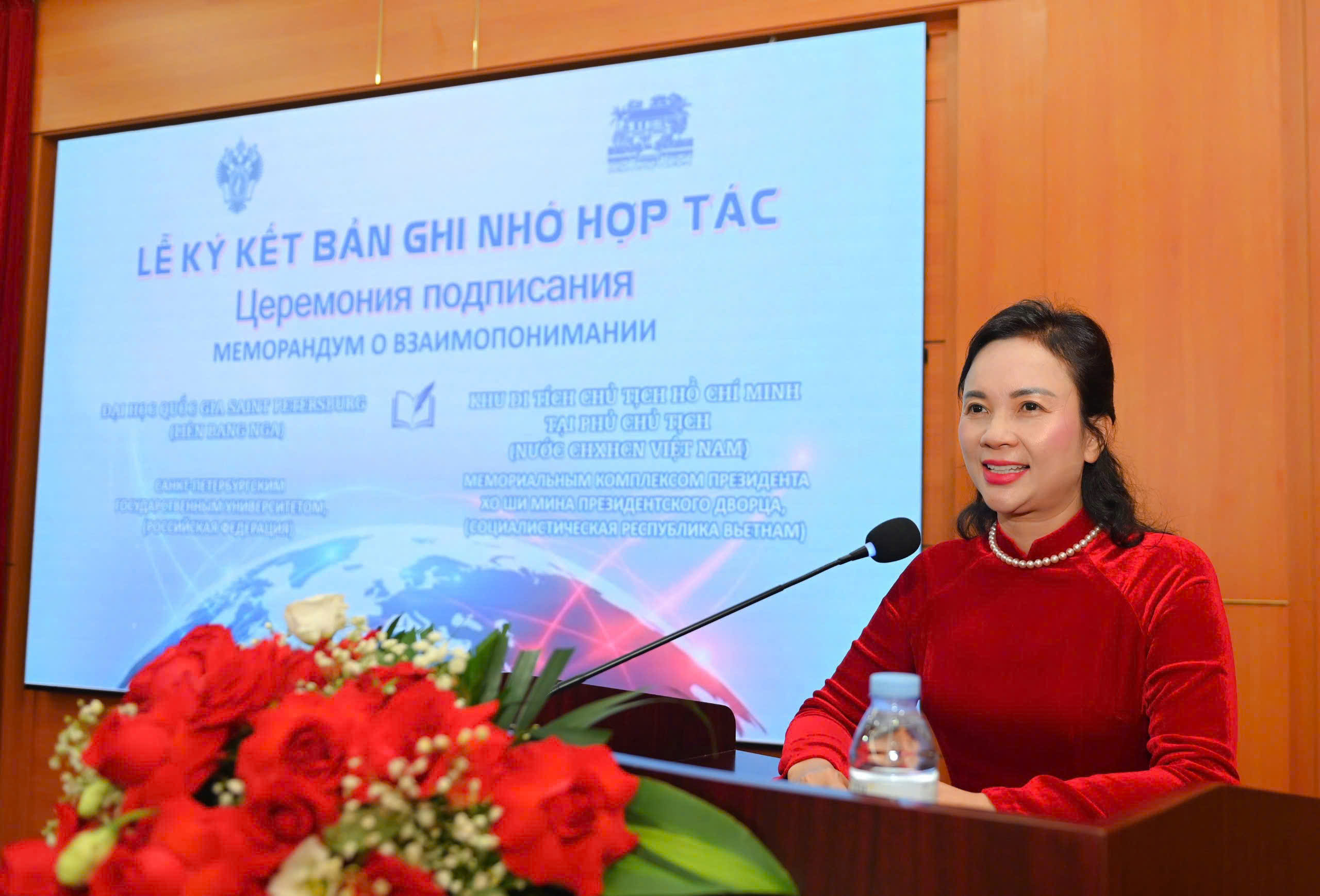 "Bản ghi nhớ hợp tác mở ra một giai đoạn mới trong quan hệ hợp tác giữa Khu Di tích Phủ Chủ tịch và trường Đại học Quốc gia Saint Petersburg. Tôi đánh giá đây là bản ghi nhớ hợp tác mang giá trị kép, vừa góp phần tôn vinh Chủ tịch Hồ Chí Minh trên bình diện thế giới vừa thúc đẩy hợp tác quốc tế về nghiên cứu khoa học giữa hai đơn vị", bà Lê Thị Phượng nhấn mạnh.