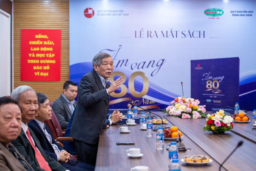 TS Phạm Quốc Quân - Ủy viên Thường vụ Hội Di sản Văn hóa Việt Nam, nguyên Giám đốc Bảo tàng Lịch sử Quốc gia phát biểu tại Lễ ra mắt sách