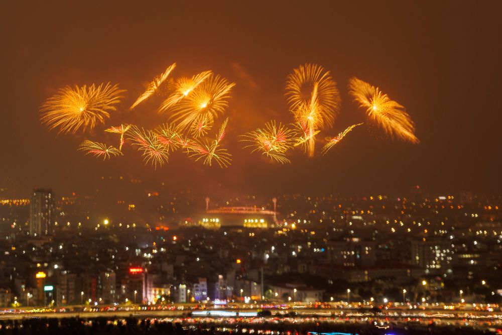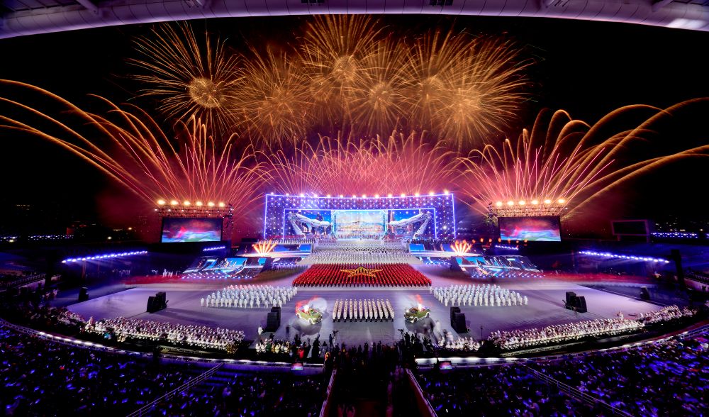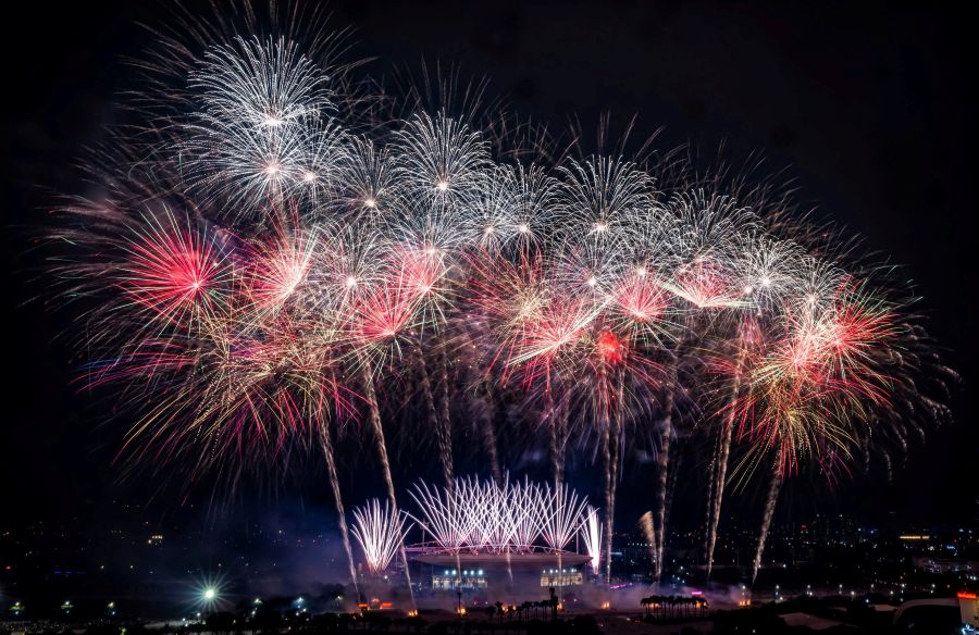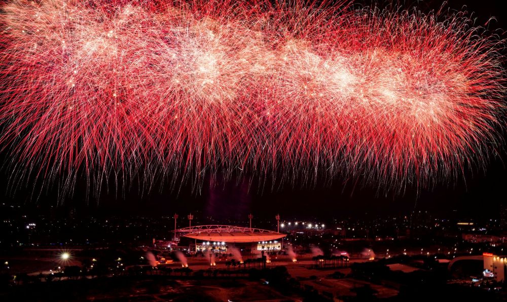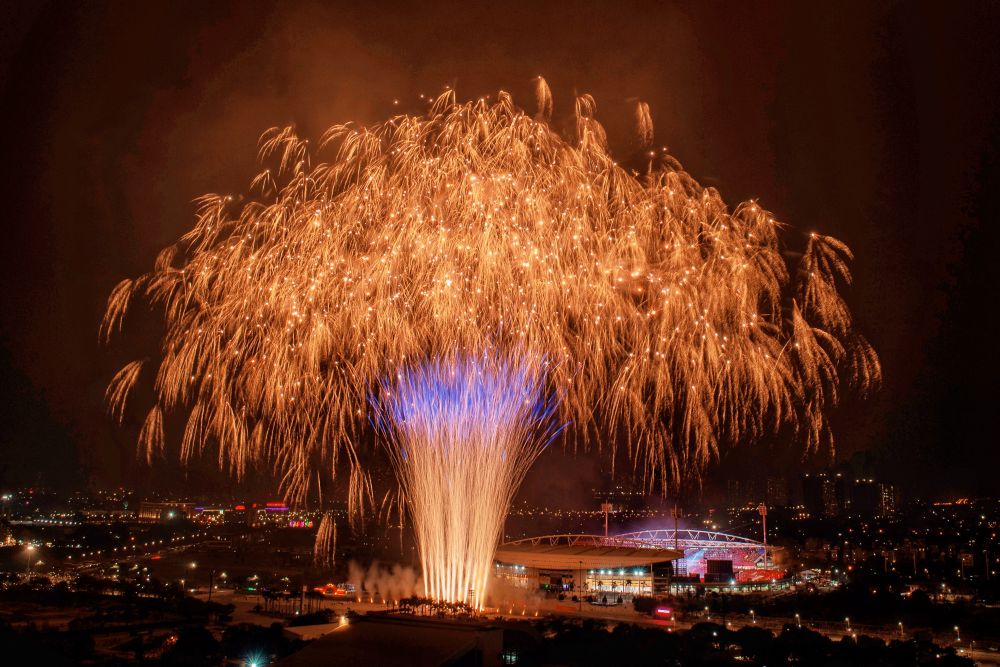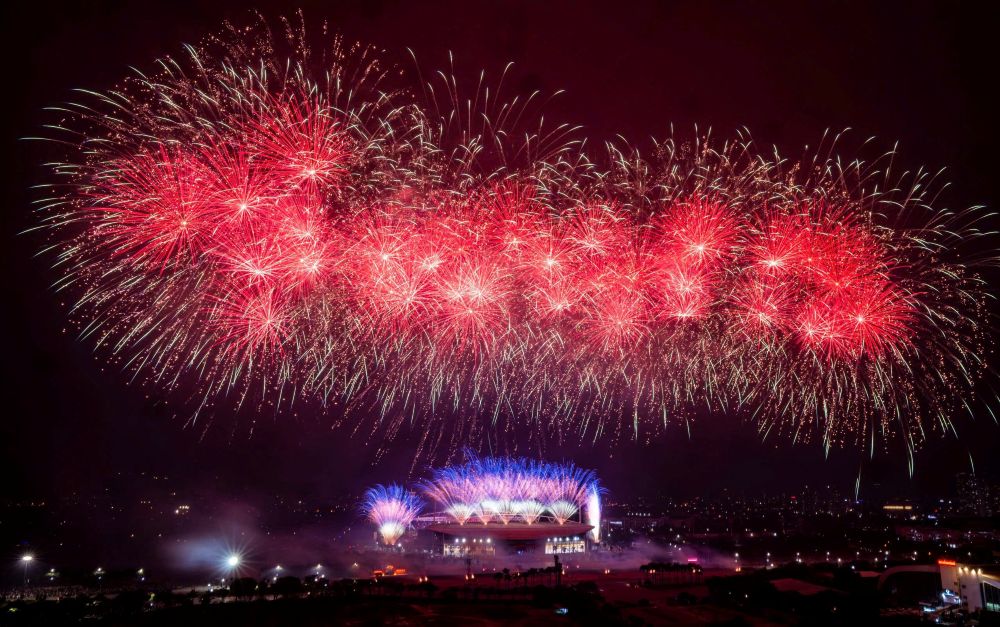 Ở những cao trào của chương trình, hàng nghìn quả pháo hoa tầm cao đồng loạt khai hỏa, kết hợp hệ thống giàn phun hỏa thuật trên mái và hai cánh khán đài, đẩy cảm xúc khán giả lên đỉnh điểm.