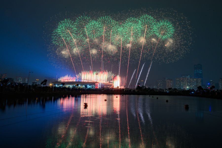 Cuối chương trình, bầu trời Mỹ Đình rực sáng với màn pháo hoa tổng lực, đa sắc màu, được lập trình chính xác đến từng phần nghìn giây, tạo nên khoảnh khắc thị giác mãn nhãn và đầy xúc cảm.